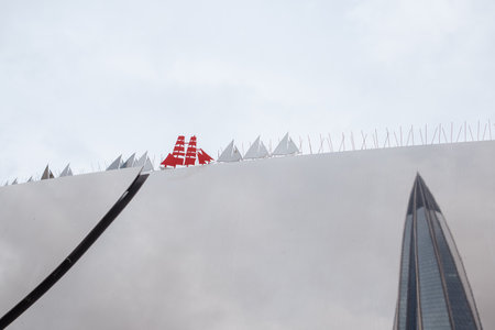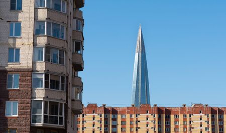 St. Petersburg, Russia-April 06 2019 Lakhta center tower in St. Petersburg with a fragment of houses in the foreground. close up