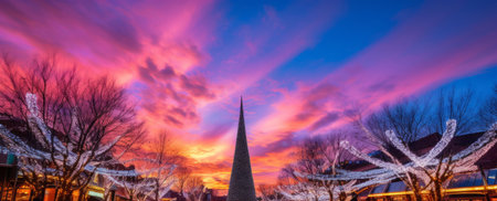 A Christmas Eve Christmas scene featuring a tall, illuminated tree set against a breathtaking twilight sky painted in hues of pink and purple.Background