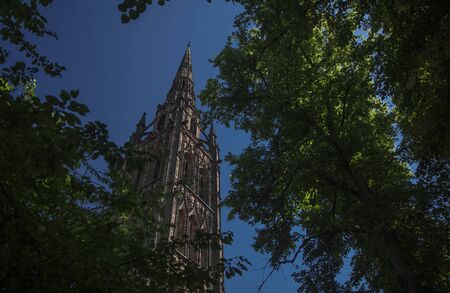 View of the top of the Scott Monument against the blue sky, Edinburgh, Scotland
