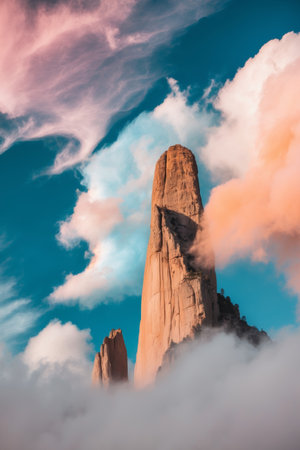 AI Generated. Tall Rock Formations Emerging from Colorful Clouds
