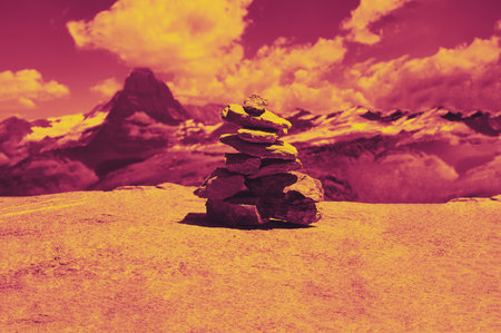 Stack of stones on top of the mountain. Pile of rocks stone and mountains. Balanced stone pyramid or Stacked stone or mountain stones tower. Stones arranged for meditation. Represent spirit of Zen.