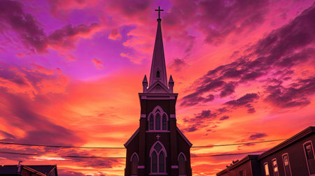 A church steeple silhouetted against a vibrant pink and purple sunset sky. Peaceful and inspiring.