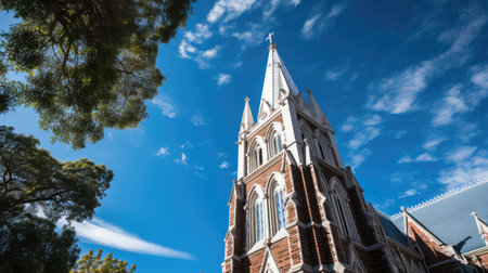 A stunning view of a gothic church steeple rising against a minimalist sky, embodying timeless beauty and inviting reflection on faith and architecture in urban life.