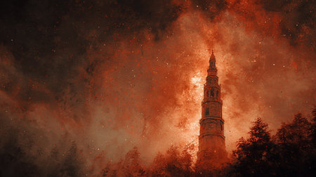 A striking image of a gothic church steeple piercing a dark sky filled with birds. The atmosphere evokes a sense of mystery and spirituality, highlighting the beauty of architecture.