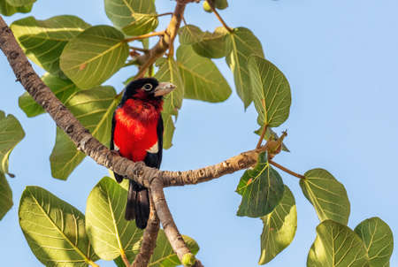 A Bearded Barbet (Pogonornis dubius) perched in a tree. Bird species with very odd shaped bill.