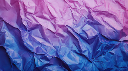 Crumpled foil texture with a vibrant gradient of pastel pink, blue, and peach tones, creating a dynamic and artistic background.