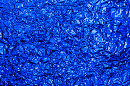 Bright blue foil background with shiny crumpled surface for texture background. Iridescent surface wrinkled foil.