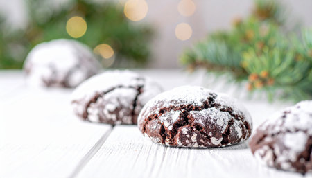 Chocolate crinkle cookies generously dusted with powdered sugar sit on a white wooden surface with blurred pine branches.