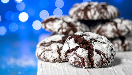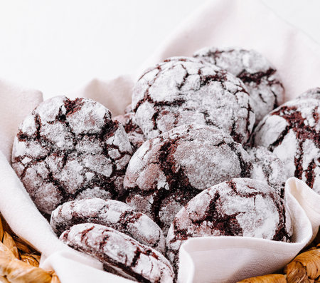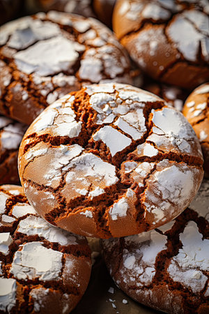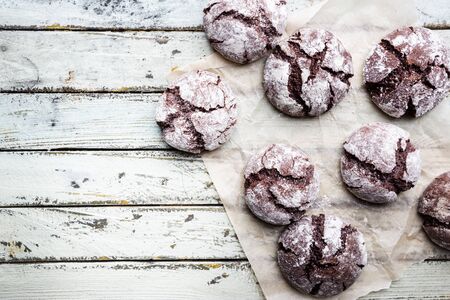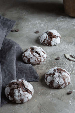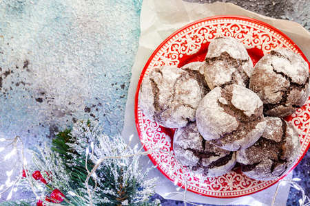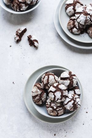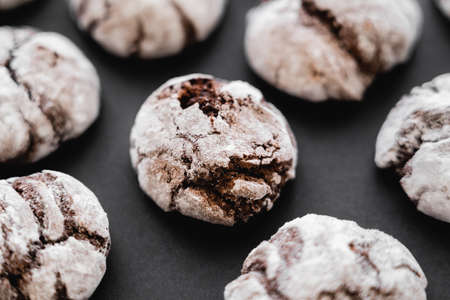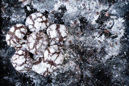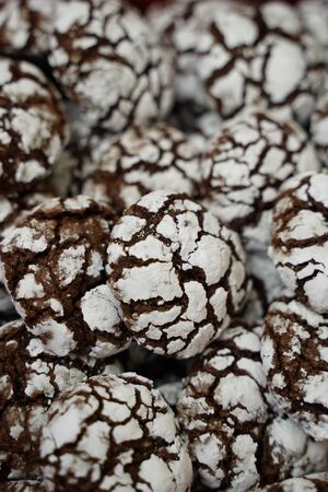 Chocolate crinkle cookies dusted with powdered sugar. Christmas homemade delicious dessert.