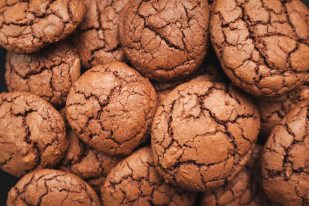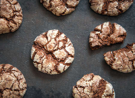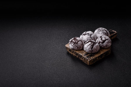 Chocolate Crinkle cookies on a black background. Cracked chocolate biscuits.