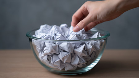 A close-up view of a hand selecting a paper star from a glass bowl filled with handcrafted origami stars that create an inviting and creative atmosphere.