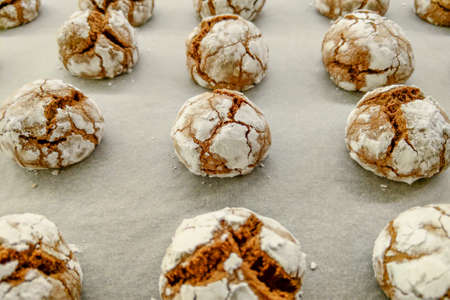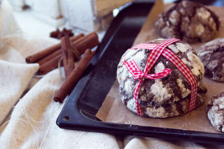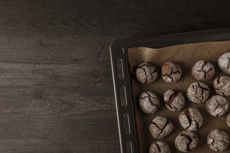 Freshly backed sweet chocolate cookies at baking sheet. Cookies sprinkled with powdered sugar. Tasty cookies on baking tray. Holiday baking concept.