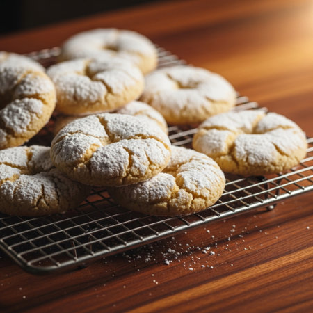 Cookies sprinkled with powdered sugar on a cooling rack on a wooden table