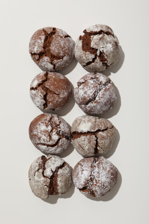 Delicious chocolate crinkle cookies arranged on a light surface with a hint of flour scattered around