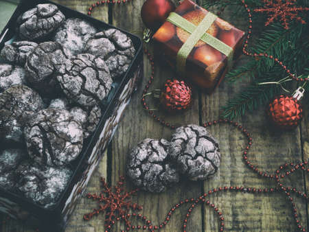 box christmas cookies chocolate with cracks.Decorated with festive decoration. Advent cakes. New Year and Xmas card. Selective focus.