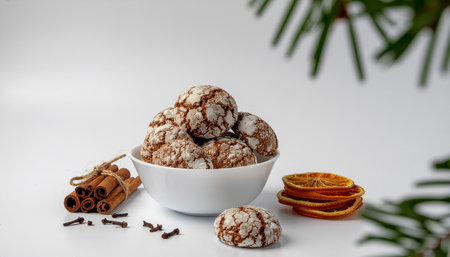 A bowl of chocolate crinkle cookies surrounded by cinnamon sticks, cloves, and dried orange slices, with evergreen branches in the background.