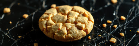 Freshly baked cookie on a dark background with scattered crumbs and cracks