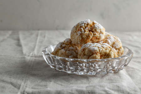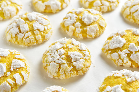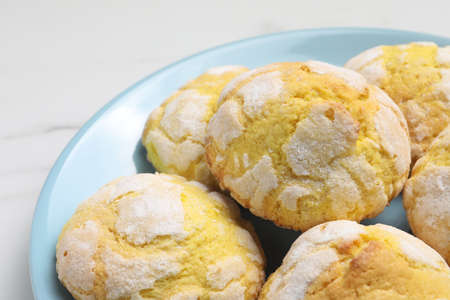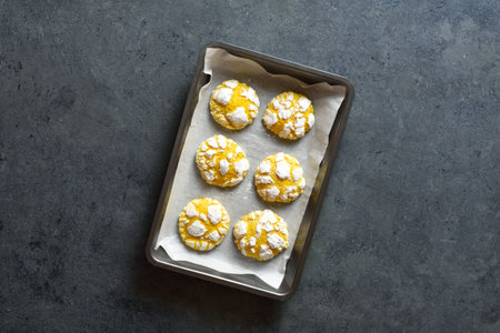 Lemon crinkle cookies on baking sheet over dark stone background with free text space. Top view, flat lay