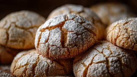 A close-up view of freshly baked cracked cookies coated in powdered sugar, showcasing their soft texture and golden-brown color on a rustic wooden surface.