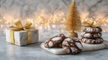 A beautiful arrangement of chocolate crinkle cookies next to a golden tree and gift box, creating a warm and inviting holiday atmosphere perfect for celebrations.