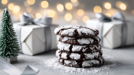 A stack of delectable chocolate cookies dusted with powdered sugar sits elegantly against a backdrop of festive gifts and soft glowing lights, perfect for holiday gatherings.