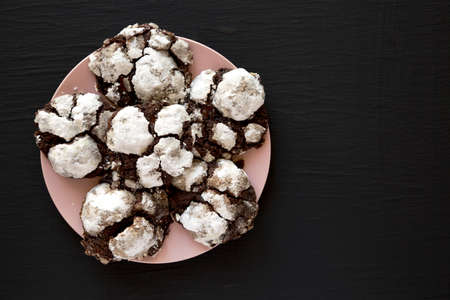 Homemade Chocolate Crinkle Cookies on a pink plate on a black background, top view. Overhead, from above, flat lay. Space for text.