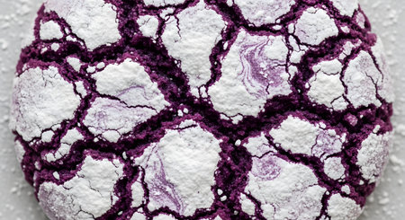 A delicious top-down macro photograph of a single purple ube crinkle cookie. The vibrant purple cookie peeks through a cracked, snowy-white layer of powdered sugar, creating a beautiful and appetizing texture. This image is perfect for bakeries, dessert recipes, and food blogs.
