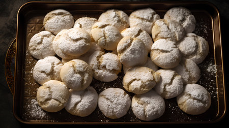 Cookies sprinkled with powdered sugar on a metal tray. Toned.
