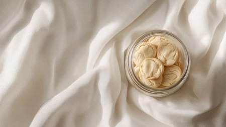 A serene arrangement featuring delicate cookies in a glass jar, set against a soft white fabric. Ideal for food lovers, bakers, or culinary enthusiasts.