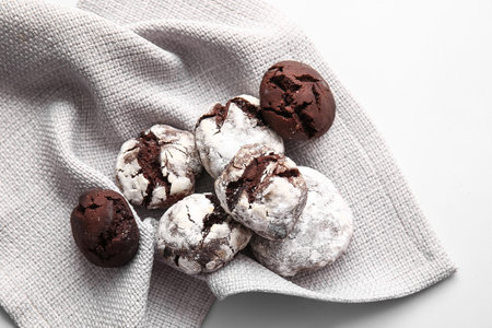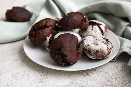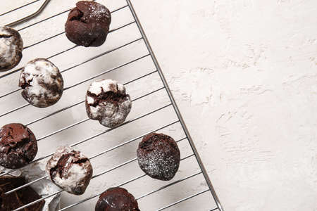 Sweet chocolate crinkle cookies in icing sugar on the light background, selective focus image