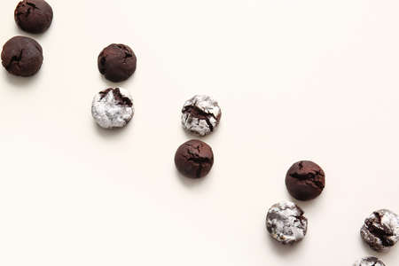 Chocolate brownie cookies with crack on white background. Cracked chocolate biscuits. Christmas Yummy background.