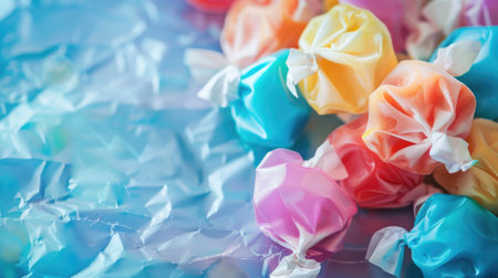 Crumpled foil texture with a vibrant gradient of pastel pink, blue, and peach tones, creating a dynamic and artistic background.