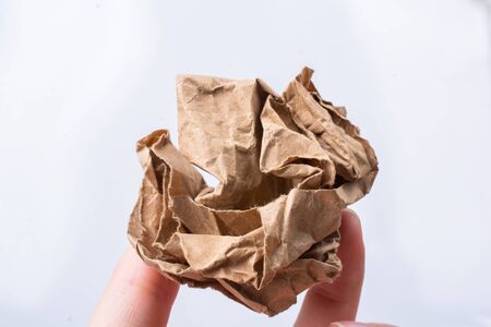 Female hand holds a crumpled paper ball on a white background.