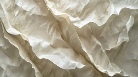 A crumpled silk fabric texture background in soft ivory white. The delicate folds and subtle sheen create a romantic, vintage aesthetic ideal for bridal wear, luxury interiors, and timeless textile designs.