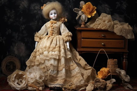 antique dolls delicate lace dress and accessories, created with generative ai