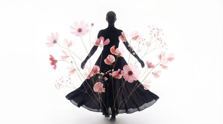 Romantic look of elegant woman silhouette surrounded by pink flowers on white background