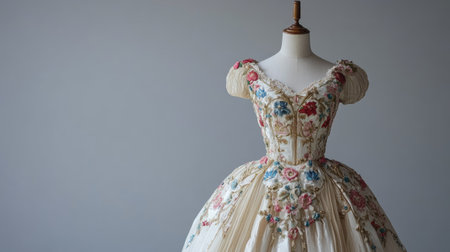 European princess dress with floral embroidery, showcased on a mannequin, with ample copy space on a plain background.