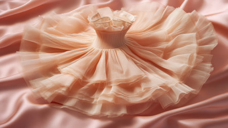 A stunning pink tulle dress is beautifully arranged on soft satin fabric. The delicate ruffles and layers create an elegant and playful appearance, perfect for fashion displays.