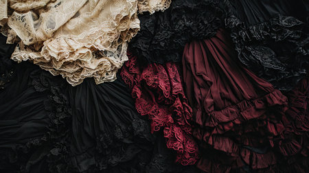 Close-up view of a collection of layered fabrics, predominantly dark colors with lace and ruffles. The fabrics are arranged in a way that showcases their textures and patterns.