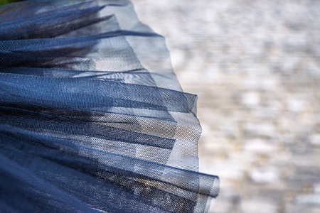 Closeup of delicate texture of a layered ballet tutu in soft, translucent fabric against a stone pavement background, symbolizing the grace and beauty of classical dance attire.