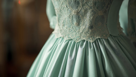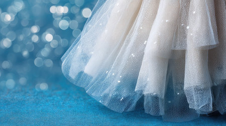 Close-up image of an elegant tulle dress featuring layered fabric and sparkling details against a soft blue background, perfect for fashion projects and event themes.