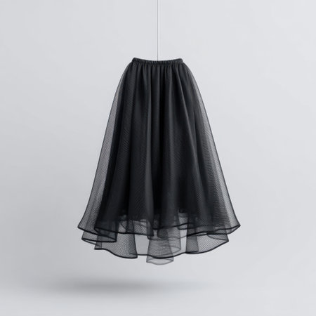 A graceful black tulle skirt gracefully suspended against a soft background, ideal for showcasing modern fashion, elegance, and style in a minimalist setting.