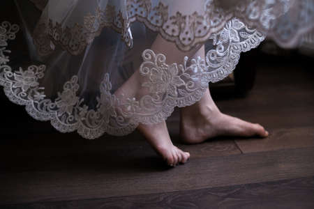 Beautiful bridal legs before the wedding on the dark wooden floor. Morning of the bride. Barefoot legs of the girl. The bride in a peignoir and lace veil.