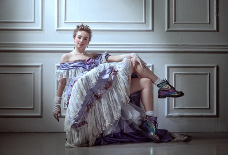 Cinematic portrait of young pretty girl in image of medieval royal person in renaissance style attire isolated on dark background. Comparison of eras, humor, history