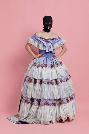 Comic portrait of young funny girl in image of medieval royal person in renaissance style dress and black balaclava isolated on pink background. Comparison of eras, beauty