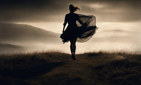 A woman dressed in a long, vintage gown walks alone on a winding, empty road. The landscape features tall grasses and bare trees under a cloudy sky, creating a serene yet haunting atmosphere.