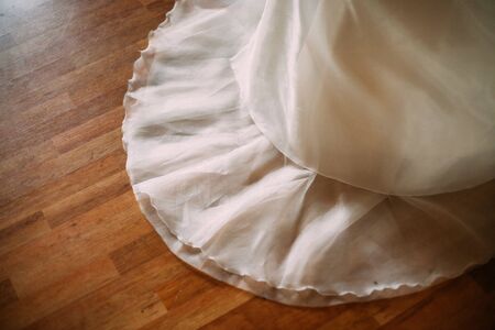 Beautiful wedding with white hem dress bow. Closeup