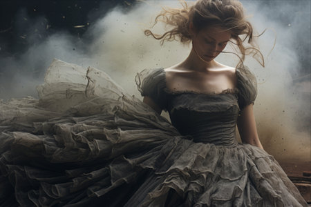 Explore the captivating beauty of a young woman in a flowing white gown, capturing ethereal elegance through dramatic fabric movement against a dark background.