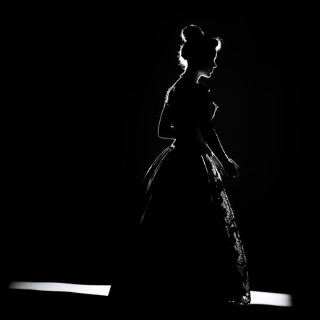 a woman in a red dress is silhouetted against a backdrop of luminous shadows in this distinctive black and white photograph. the baroque extravagance of her traditional costume adds an air of elegance and drama. this artistic reportage captures the essence of carolina herrera's designs, as seen through the lens of myroslava sviridova. ai generated