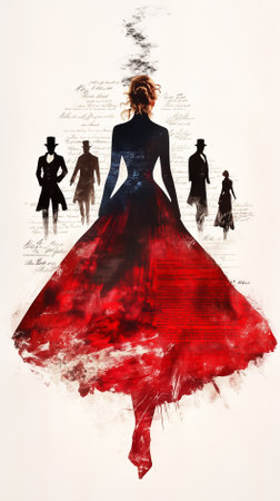 Woman in flowing red dress surrounded by silhouettes of men and children. Artistic setting with rich colors and abstract patterns. Concept of fashion, elegance, artistic expression.